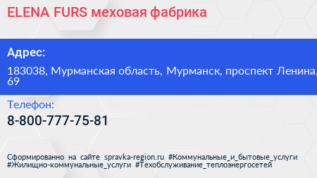 ELENA FURS, меховая фабрика по адресу 183038, Мурманская область, Мурманск, проспект Ленина, 69 в дальнейшем Организация, размещена в следующих категориях: