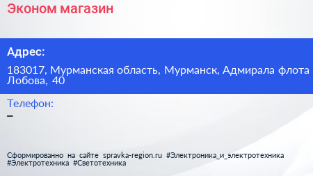 Эконом, магазин по адресу 183017, Мурманская область, Мурманск, Адмирала флота Лобова, 40 в дальнейшем Организация, размещена в следующих категориях: