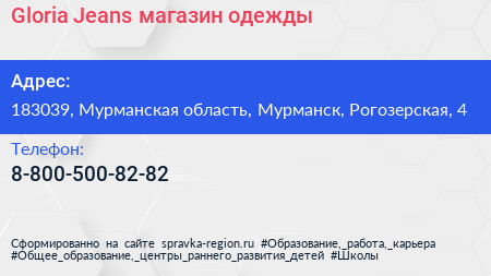 Gloria Jeans, магазин одежды по адресу 183039, Мурманская область, Мурманск, Рогозерская, 4 в дальнейшем Организация, размещена в следующих категориях: