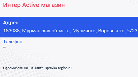 Интер Active, магазин по адресу 183038, Мурманская область, Мурманск, Воровского, 5/23 в дальнейшем Организация, размещена в следующих категориях: