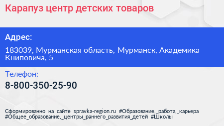 Карапуз, центр детских товаров по адресу 183039, Мурманская область, Мурманск, Академика Книповича, 5 в дальнейшем Организация, размещена в следующих категориях: