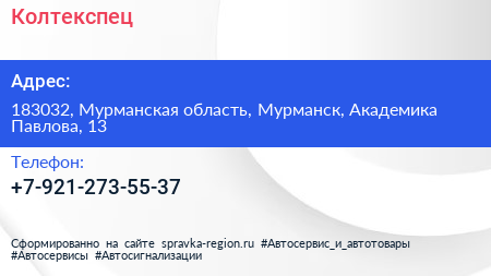 Колтекспец по адресу 183032, Мурманская область, Мурманск, Академика Павлова, 13 в дальнейшем Организация, размещена в следующих категориях: