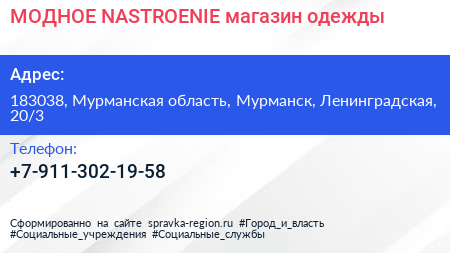 МОДНОЕ NASTROENIE, магазин одежды по адресу 183038, Мурманская область, Мурманск, Ленинградская, 20/3 в дальнейшем Организация, размещена в следующих категориях: