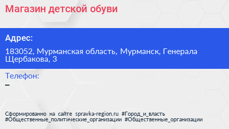 Магазин детской обуви по адресу 183052, Мурманская область, Мурманск, Генерала Щербакова, 3 в дальнейшем Организация, размещена в следующих категориях: