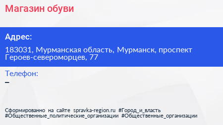 Магазин обуви по адресу 183031, Мурманская область, Мурманск, проспект Героев-североморцев, 77 в дальнейшем Организация, размещена в следующих категориях: