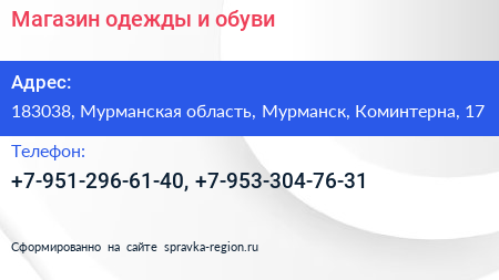 Магазин одежды и обуви по адресу 183038, Мурманская область, Мурманск, Коминтерна, 17 в дальнейшем Организация, размещена в следующих категориях: