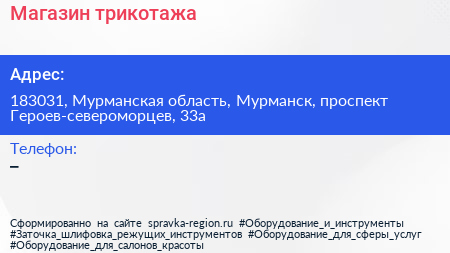 Магазин трикотажа по адресу 183031, Мурманская область, Мурманск, проспект Героев-североморцев, 33а в дальнейшем Организация, размещена в следующих категориях: