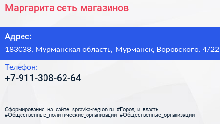 Маргарита, сеть магазинов по адресу 183038, Мурманская область, Мурманск, Воровского, 4/22 в дальнейшем Организация, размещена в следующих категориях: