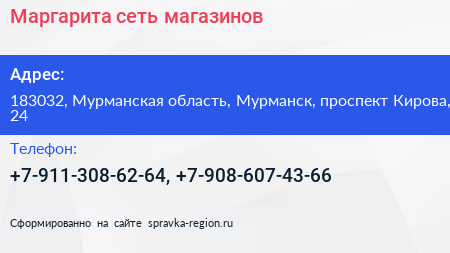 Маргарита, сеть магазинов по адресу 183032, Мурманская область, Мурманск, проспект Кирова, 24 в дальнейшем Организация, размещена в следующих категориях: