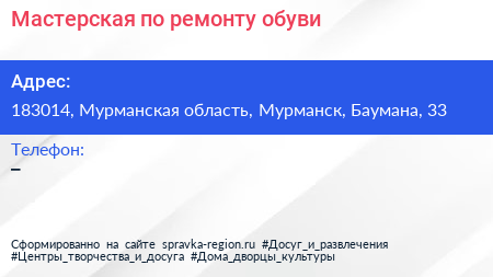 Мастерская по ремонту обуви по адресу 183014, Мурманская область, Мурманск, Баумана, 33 в дальнейшем Организация, размещена в следующих категориях: