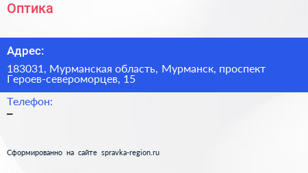 Оптика по адресу 183031, Мурманская область, Мурманск, проспект Героев-североморцев, 15 в дальнейшем Организация, размещена в следующих категориях: