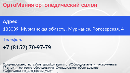 ОртоМания, ортопедический салон по адресу 183039, Мурманская область, Мурманск, Рогозерская, 4 в дальнейшем Организация, размещена в следующих категориях: