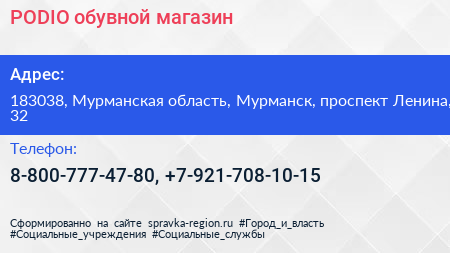 PODIO, обувной магазин по адресу 183038, Мурманская область, Мурманск, проспект Ленина, 32 в дальнейшем Организация, размещена в следующих категориях: