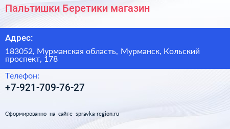 Пальтишки Беретики, магазин по адресу 183052, Мурманская область, Мурманск, Кольский проспект, 178 в дальнейшем Организация, размещена в следующих категориях: