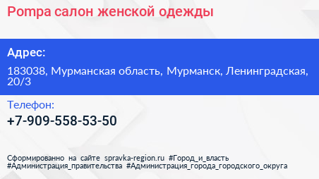 Pompa, салон женской одежды по адресу 183038, Мурманская область, Мурманск, Ленинградская, 20/3 в дальнейшем Организация, размещена в следующих категориях:
