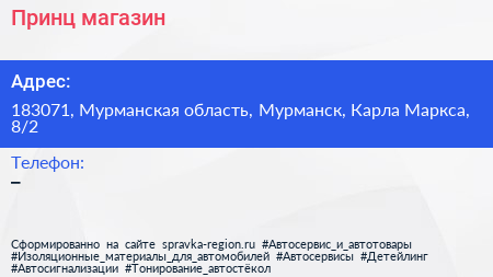 Принц, магазин по адресу 183071, Мурманская область, Мурманск, Карла Маркса, 8/2 в дальнейшем Организация, размещена в следующих категориях: