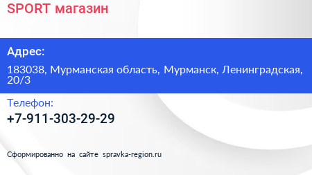 SPORT, магазин по адресу 183038, Мурманская область, Мурманск, Ленинградская, 20/3 в дальнейшем Организация, размещена в следующих категориях: