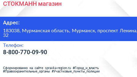 СТОКМАНН, магазин по адресу 183038, Мурманская область, Мурманск, проспект Ленина, 32 в дальнейшем Организация, размещена в следующих категориях: