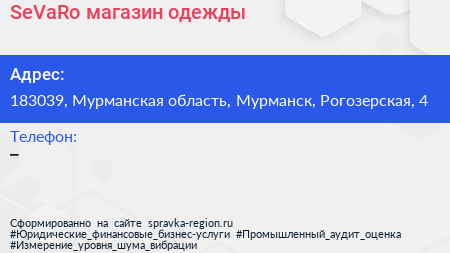 SeVaRo, магазин одежды по адресу 183039, Мурманская область, Мурманск, Рогозерская, 4 в дальнейшем Организация, размещена в следующих категориях: