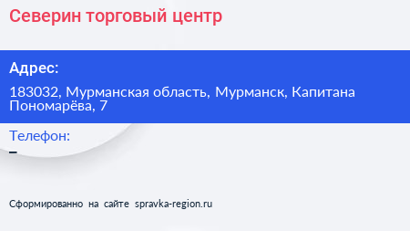 Северин, торговый центр по адресу 183032, Мурманская область, Мурманск, Капитана Пономарёва, 7 в дальнейшем Организация, размещена в следующих категориях: