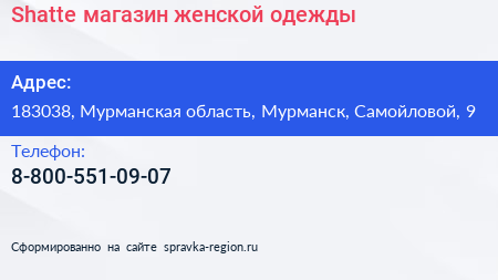 Shatte, магазин женской одежды по адресу 183038, Мурманская область, Мурманск, Самойловой, 9 в дальнейшем Организация, размещена в следующих категориях: