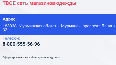 ТВОЕ, сеть магазинов одежды по адресу 183038, Мурманская область, Мурманск, проспект Ленина, 32 в дальнейшем Организация, размещена в следующих категориях: