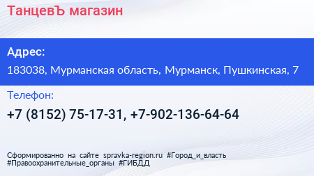 ТанцевЪ, магазин по адресу 183038, Мурманская область, Мурманск, Пушкинская, 7 в дальнейшем Организация, размещена в следующих категориях:
