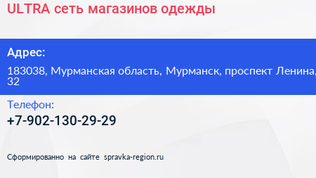 ULTRA, сеть магазинов одежды по адресу 183038, Мурманская область, Мурманск, проспект Ленина, 32 в дальнейшем Организация, размещена в следующих категориях: