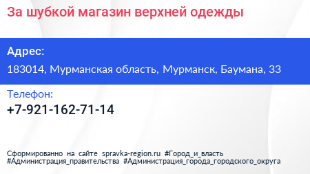 За шубкой, магазин верхней одежды по адресу 183014, Мурманская область, Мурманск, Баумана, 33 в дальнейшем Организация, размещена в следующих категориях: