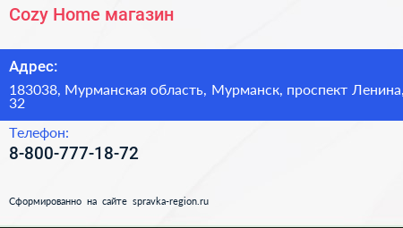 Cozy Home, магазин по адресу 183038, Мурманская область, Мурманск, проспект Ленина, 32 в дальнейшем Организация, размещена в следующих категориях: