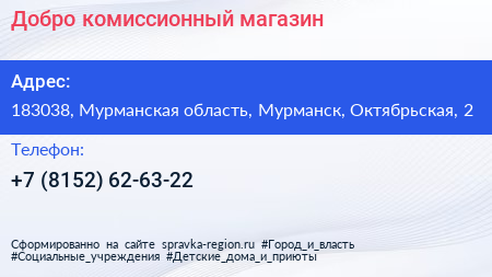 Добро, комиссионный магазин по адресу 183038, Мурманская область, Мурманск, Октябрьская, 2 в дальнейшем Организация, размещена в следующих категориях: