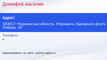 Домофей, магазин по адресу 183017, Мурманская область, Мурманск, Адмирала флота Лобова, 40 в дальнейшем Организация, размещена в следующих категориях: