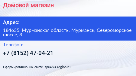 Домовой, магазин по адресу 184635, Мурманская область, Мурманск, Североморское шоссе, 8 в дальнейшем Организация, размещена в следующих категориях:
