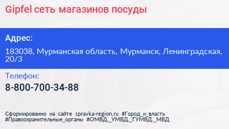 Gipfel, сеть магазинов посуды по адресу 183038, Мурманская область, Мурманск, Ленинградская, 20/3 в дальнейшем Организация, размещена в следующих категориях: