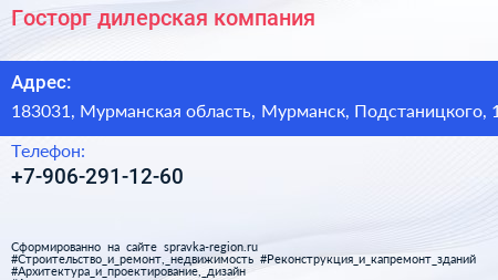 Госторг, дилерская компания по адресу 183031, Мурманская область, Мурманск, Подстаницкого, 1 в дальнейшем Организация, размещена в следующих категориях: