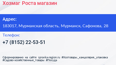 Хозмаг Роста, магазин по адресу 183017, Мурманская область, Мурманск, Сафонова, 28 в дальнейшем Организация, размещена в следующих категориях: