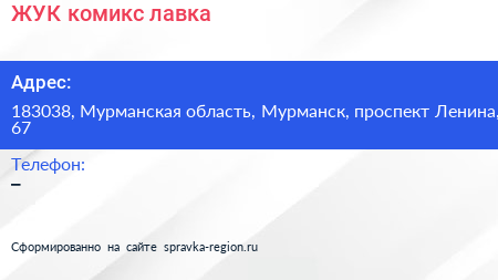 ЖУК, комикс-лавка по адресу 183038, Мурманская область, Мурманск, проспект Ленина, 67 в дальнейшем Организация, размещена в следующих категориях: