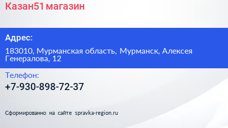 Казан51, магазин по адресу 183010, Мурманская область, Мурманск, Алексея Генералова, 12 в дальнейшем Организация, размещена в следующих категориях: