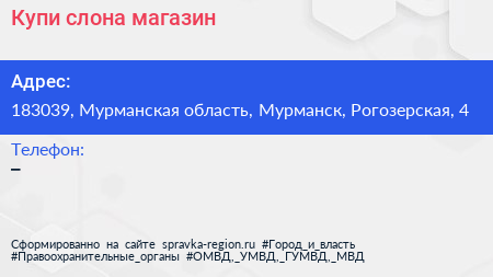 Купи слона, магазин по адресу 183039, Мурманская область, Мурманск, Рогозерская, 4 в дальнейшем Организация, размещена в следующих категориях: