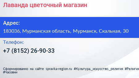 Лаванда, цветочный магазин по адресу 183036, Мурманская область, Мурманск, Скальная, 30 в дальнейшем Организация, размещена в следующих категориях: