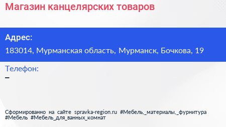 Магазин канцелярских товаров по адресу 183014, Мурманская область, Мурманск, Бочкова, 19 в дальнейшем Организация, размещена в следующих категориях: