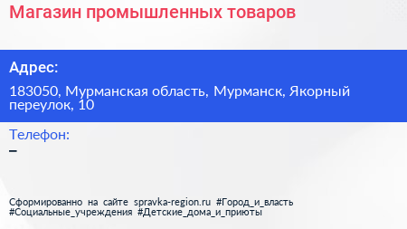Магазин промышленных товаров по адресу 183050, Мурманская область, Мурманск, Якорный переулок, 10 в дальнейшем Организация, размещена в следующих категориях: