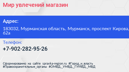 Мир увлечений, магазин по адресу 183032, Мурманская область, Мурманск, проспект Кирова, 62а в дальнейшем Организация, размещена в следующих категориях: