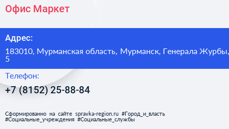 Офис-Маркет по адресу 183010, Мурманская область, Мурманск, Генерала Журбы, 5 в дальнейшем Организация, размещена в следующих категориях:
