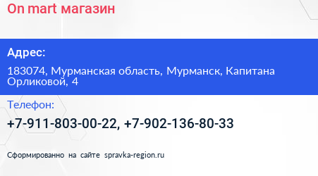 On mart, магазин по адресу 183074, Мурманская область, Мурманск, Капитана Орликовой, 4 в дальнейшем Организация, размещена в следующих категориях:
