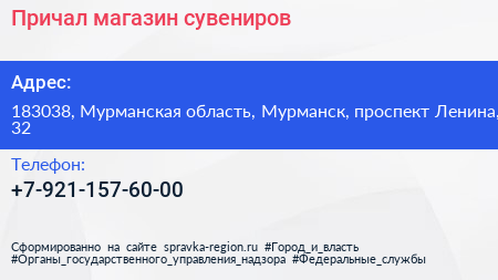 Причал, магазин сувениров по адресу 183038, Мурманская область, Мурманск, проспект Ленина, 32 в дальнейшем Организация, размещена в следующих категориях: