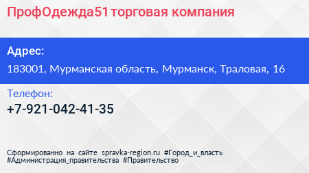 ПрофОдежда51, торговая компания по адресу 183001, Мурманская область, Мурманск, Траловая, 16 в дальнейшем Организация, размещена в следующих категориях: