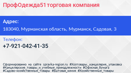 ПрофОдежда51, торговая компания по адресу 183040, Мурманская область, Мурманск, Садовая, 3 в дальнейшем Организация, размещена в следующих категориях: