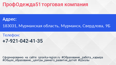 ПрофОдежда51, торговая компания по адресу 183031, Мурманская область, Мурманск, Свердлова, 9Б в дальнейшем Организация, размещена в следующих категориях: