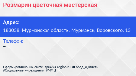 Розмарин, цветочная мастерская по адресу 183038, Мурманская область, Мурманск, Воровского, 13 в дальнейшем Организация, размещена в следующих категориях: